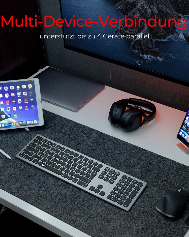KeySonic KSK-8023BTRF (DE), Full-Size Aluminium Tastatur, Bluetooth® & RF, für Windows® und macOS®, anthrazit/schwarz, Volle Größe (100%), Kabellos, Bluetooth, Membran Key Switch, QWERTZ, Anthrazit, Schwarz