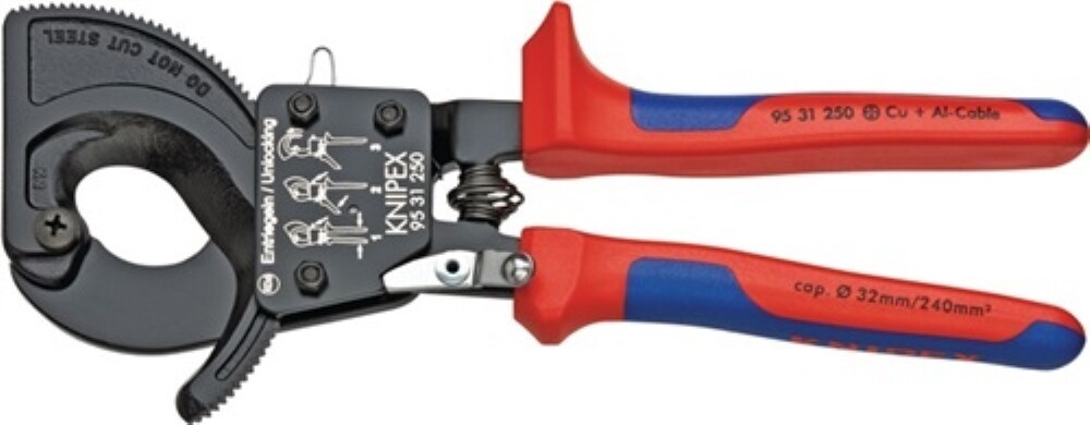 Zum Schneiden von Cu- und Al-Kabeln, ein- und mehrdrähtig. Nicht für Stahldraht und Drahtseile geeignet. Gehärtete Schneiden mit Präzisionsschliff. Schneidet glatt und sauber, ohne zu quetschen. Einhandbetätigung durch Ratschenprinzip. Geringer Kraftbedarf durch sehr hohe Übersetzung. Zweigang-Zahnkranzantrieb für leichtes Schneiden. Einfache Handhabung durch geringes Gewicht und kompakte Bauweise Einsatz auch unter beengten Platzverhältnissen möglich. Klemmschutz verhindert Quetschverletzungen. Spezial-Werkzeugstahl in Sondergüte, geschmiedet, ölgehärtet Modell: Festschenkel-Hülle mit Standfläche zum Auflegen beim Schneiden. Bei Aluminiumleitern bis 4 x 150 mm² Sektorkabel einsetzbar.