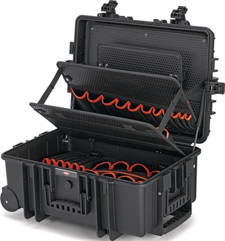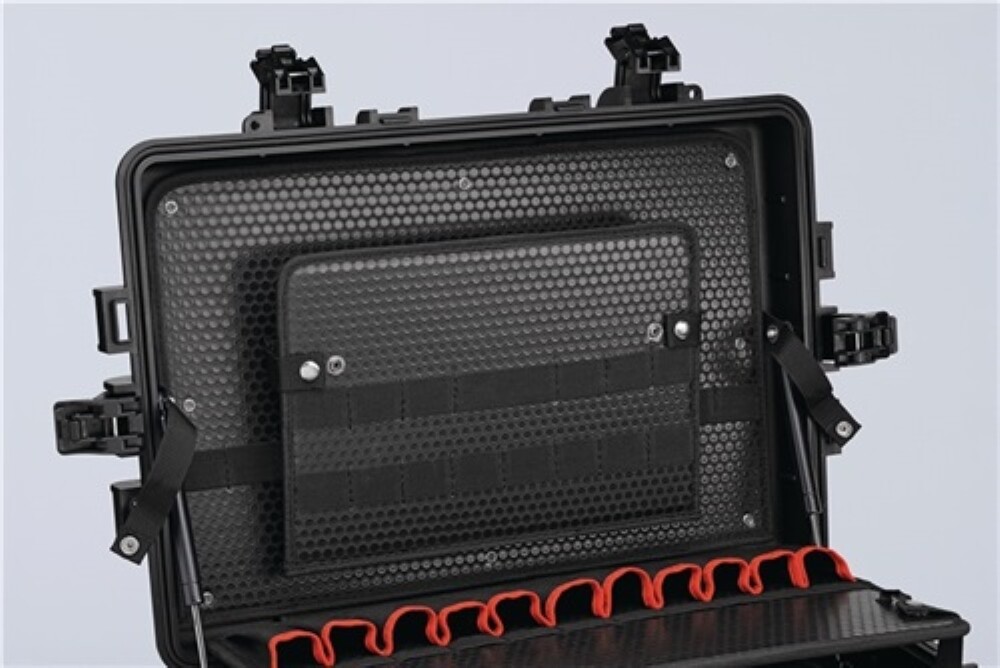 Flugtauglicher Koffer aus schlagfestem Polypropylen. Staub- und wasserdicht. Automatisches Druckausgleichventil. Temperaturstabil von - 30°C bis + 80°C. Vorrichtung für Vorhängeschloss. Dokumentenfach, Werkzeugtafeln mit 54 bestückbaren Werkzeugtaschen und 94 Werkzeugschlaufen. Verschließbare Bodenschale individuell unterteilbar durch Aluminium-Trennstegesystem. Ergonomischer Zweikomponenten-Griff. Mit zwei leicht laufenden Rollen. Mit Teleskopgriff. Volumen: 45 l, Belastbarkeit bis 35 kg.