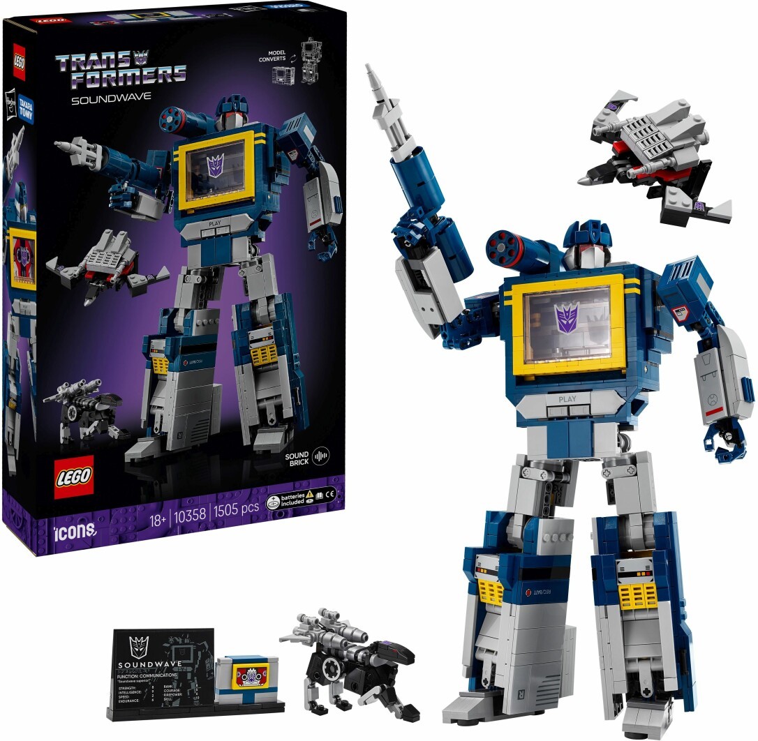 LEGO Icons Transformers: Soundwave (10358) ist ein detailreiches Modellbau Set für Erwachsene, das Fans der legendären Transformers-Reihe begeistert. Mit dieser ikonischen Roboterfigur entstehen nicht nur nostalgische Erinnerungen, sondern auch eine außergewöhnliche LEGO Dekoration für Wohnzimmer, Regal oder Schreibtisch als Geschenk für Männer und Frauen, die Technik und Design lieben. Soundwave ist voll beweglich, lässt sich in einen Kassettenspieler verwandeln und spielt auf Knopfdruck originale Sprach- und Soundeffekte ab. Ausgestattet mit Raketenpod, Laserblaster und Pfeilen bietet die Figur echten Sammlerwert. Auch Ravage und Laserbeak sind dabei beide lassen sich zu Kassetten umbauen, die in Soundwaves Schacht eingesetzt werden können. Eine Infotafel mit Leistungsdaten rundet das Display ab. Das LEGO Transformers Set besteht aus 1.505 Teilen und ist ein kreatives DIY Projekt zum Abschalten und Gestalten. In der LEGO Builder App steht zusätzlich eine digitale 3D-Bauanleitung bereit. Ob als Bastelset, Geschenk oder LEGO Deko dieses LEGO Set ist eine beeindruckende Hommage an die Kultserie und eine hochwertige Ergänzung für jede Sammlung. Soundwave ist eine 33 cm große Actionfigur Enthält 1.505 Teile