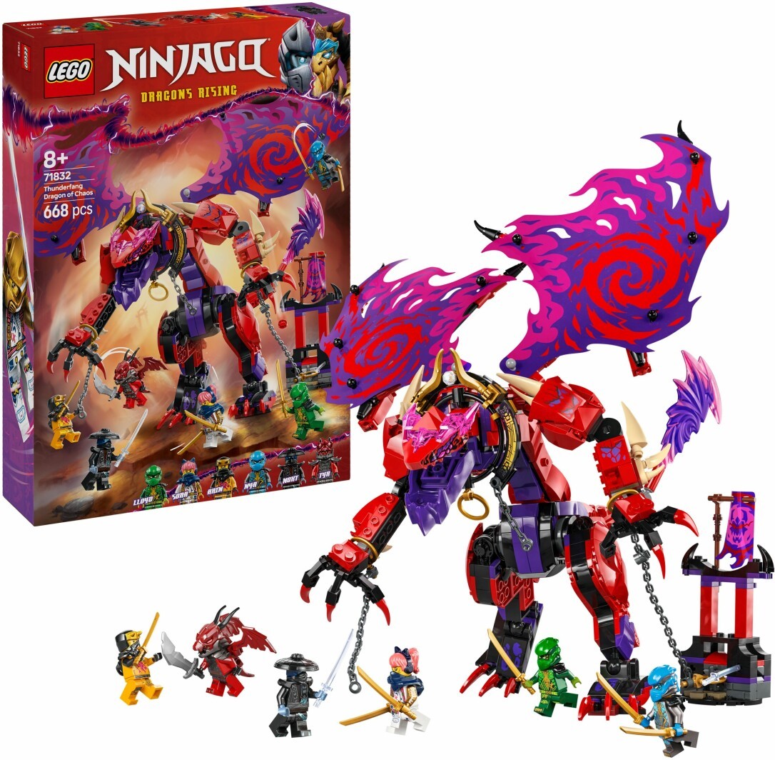 LEGO NINJAGO Chaosdrache Donnerzahn (71832) ist ein fantasievolles Spielset, mit dem Jungen und Mädchen ab 8 Jahren spannende Actionszenen aus der 3. Staffel der TV-Serie NINJAGO Aufstieg der Drachen nachstellen können. Dieses Bauset für Kinder beinhaltet einen großen Spielzeug Drachen, der Schwanz, Kopf und Maul sowie Füße, Beine und Flügel bewegen kann. Außerdem trägt er einen Shooter unter jedem Flügel. Die Drachenfigur ist an ein kleines Nebenmodell gekettet. Mit den beiden Prismaklingen kann man ihn von den Ketten befreien. Das LEGO Bauspielzeug beinhaltet 6 NINJAGO Minifiguren: Die Ninja-Helden Lloyd, Nya, Arin und Sora tragen Ninja-Ausrüstung, und die beiden Bösewichte Nokt und der Anführer der Drachenmenschen namens Tyr sind ebenfalls bestens für spannende Duelle zwischen Gut und Böse ausgerüstet. In dem breiten Angebot an separat erhältlichen LEGO NINJAGO Bausets und baubaren Spielzeugen finden Ninja-Fans viele Mechs, Drachen und Tempel für spannende Gefechte zwischen Gut und Böse. Jedes dieser Ninja Modelle kann auch mithilfe der LEGO Builder App gebaut werden, die dich und dein Kind auf ein ebenso einfaches wie intuitives Bauabenteuer mitnimmt. Der Chaosdrache Donnerzahn ist 24 cm groß. Enthält 668 Teile.