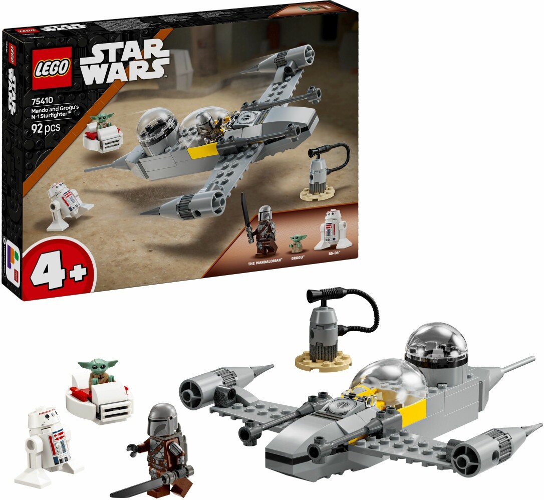 Mandos und Grogus N-1 Starfighter (75410) ist ein faszinierendes Bau- und Spielset, das Vorschulkindern beibringt, wie man mit LEGO Steinen Modelle baut und Fantasy-Abenteuer aus der 3. Staffel von Star Wars: The Mandalorian darstellt. Der N-1 Starfighter ist ein tolles Star Wars Geschenk für Jungen, Mädchen und Fans ab 4 Jahren. Ein Starter-Bauelement lässt Kinder ganz einfach das Bauen beginnen und fantasievoll spielen. Und eine baubare Zapfsäule ist ebenfalls in diesem Star Wars Bauspielzeug mit dabei. Dieses Bauset ist sehr einfach zu bauen und eine tolle Einführung für Vorschulkinder, um sich später an komplexere Sets heranzutrauen. Neben dem Modell des N-1 Starfighters beinhaltet das Fantasy Spielset auch 3 LEGO Star Wars Minifiguren: den Mandalorianer mit Dunkelschwert und Raketenrucksack, Grogu in seiner Repulsorwiege sowie den Droiden R5-D4. Setz Mando in das aufklappbare Cockpit des N-1 Starfighters. Und die Grogu Figur kann im Heck Platz nehmen. Die einfache Bildanleitung in diesem Starterset eignet sich für Kinder, die gerade erst lesen lernen. Für zusätzlichen Bauspaß beinhaltet die LEGO Builder App intuitive Vergrößerungs- und Drehfunktionen, die Kinder digitale Ansichten des baubaren Sternenschiffs näher betrachten lassen. Beim Zusammenstecken des Modells dürfen Eltern oder ältere Geschwister gern ein wenig helfen. Der baubare Sternenjäger ist 5 cm hoch, 22 cm lang und 17 cm breit. Enthält 92 Teile.