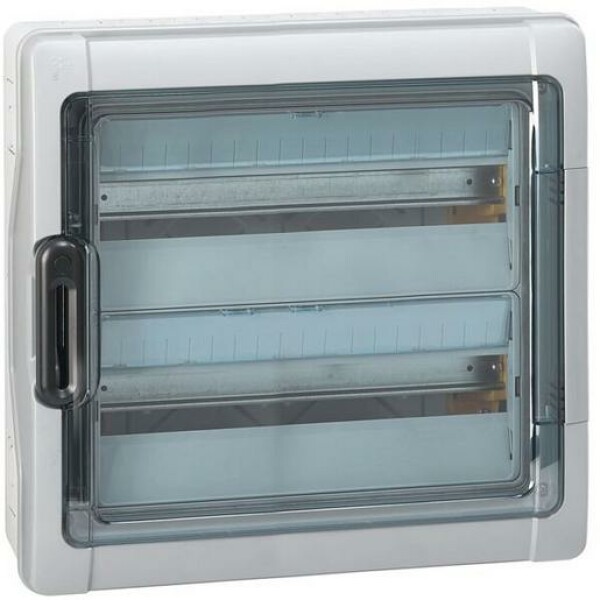 Feuchtraumverteiler Plexo³, Schutzart IP65 - IK09, 2-reihig, 36 Module (18 Module/Reihe), Abmessung 432 x 448 x 161 (Höhe x Breite x Tiefe in mm), selbstverlöschend 650 °C, inklusive N- und PE-Klemmen, Aufputzverteiler Schutzklasse II. Türen transparent, beidseitig anschlagbar. Nach EN 62208, für den Bau von Installationsverteilern nach EN 61439-3.
