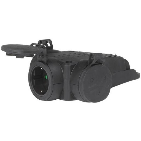 3-fach Hängekupplungen, Gummi-Ausführung 2 P+E, 10/16A, 250V~. Bruchsicherer Thermoplasteinsatz. Membran-Kabeleinführung. Lange Knickschutzhülle, angeformte Gummi-Hängeöse.