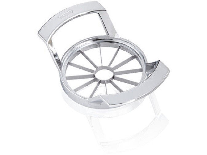 Ob zum Dekorieren oder für die kleine Mahlzeit zwischendurch: Mit dem Apfelteiler lassen sich Äpfel und Birnen blitzschnell und mundgerecht zerteilen. Massiv verchromt überzeugt der Apfelteiler Edelstahl mit durchdachten Details. Zwölf rostfreie Edelstahlklingen teilen Äpfel und Birnen in gleichmäßig große Stücke. Gleichzeitig wird das Kerngehäuse entfernt, womit zwei Arbeitsschritte in einem erledigt werden. Für eine kraftvolle Handhabung des Apfelteilers sorgen die seitlichen Griffe, die stabil und sicher in der Hand liegen. Dank seines Durchmessers von 90mm funktioniert auch das Zerteilen von großen Äpfeln problemlos.