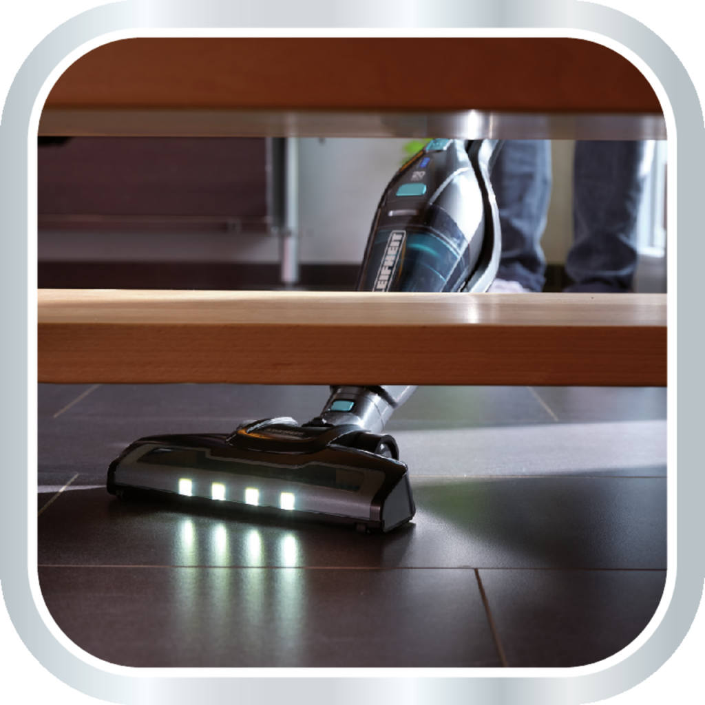 - Schmutz auch in dunklen Ecken und unter Möbeln sichtbar dank der vier Front-LEDs