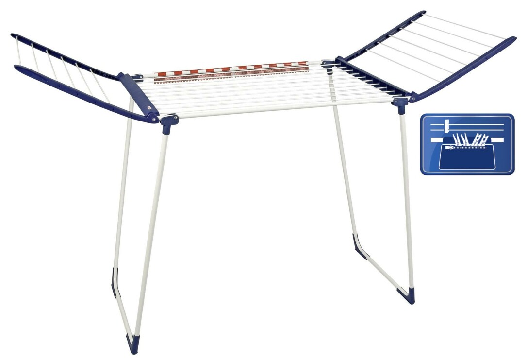 Dank der ausklappbaren Flügel können lange Teile problemlos aufgehängt werden – ohne, dass diese am Boden schleifen. Zwei Kleinteilehalter sorgen dafür, dass beispielsweise Socken vollkommen ohne Wäscheklammern getrocknet werden können. Werden diese doch einmal benötigt, sind sie mit dem mitgelieferten Wäscheklammerbeutel sofort griffbereit. Wer diesen Wäschetrockner kauft, der holt sich langlebige Leifheit-Qualität ins Haus: