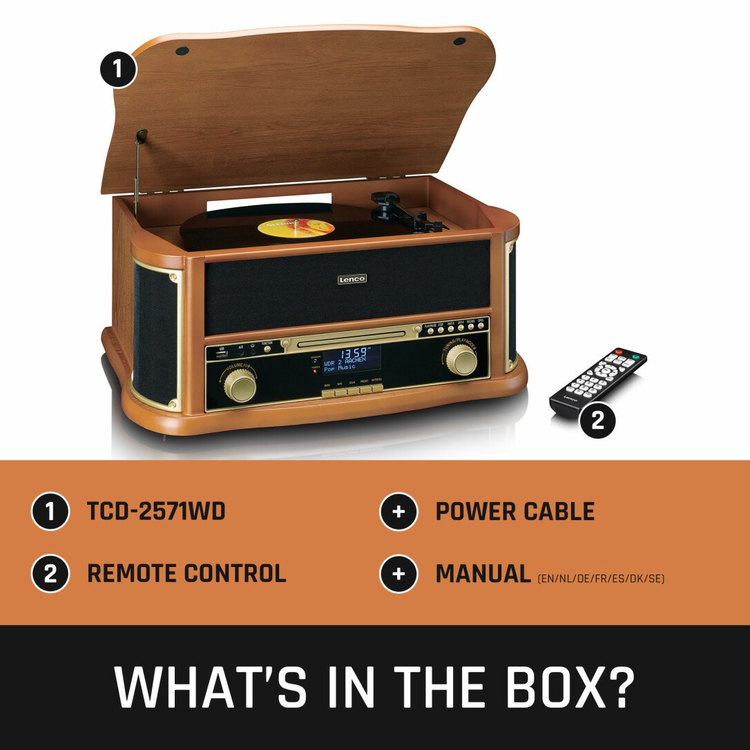 Der Classic Phono (by Lenco) TCD-2571WD ist ein multifunktionales All-in-One Musiksystem mit einem wunderschönen Retro-Design, das jedes Interieur bereichert. Der TCD-2571WD zeichnet sich durch den eingebauten Plattenspieler mit Riemenantrieb aus, bietet jedoch viel mehr als das. Der TCD-2571WD kombiniert mühelos klassische Funktionen mit modernen Wiedergabemöglichkeiten. Der hölzerne Retro-Plattenspieler verfügt unter anderem über Bluetooth-Empfang, DAB+ / FM-Radio, einen eingebauten CD-Player und einen Kassettenspieler. Dies bietet ein vollständiges Hörerlebnis mit der perfekten Balance zwischen dem nostalgischen Charme der Vintage-Ästhetik und moderner Funktionalität. Der TCD-2571WD ist mit einem MDF-Gehäuse ausgestattet und wird mit einer Fernbedienung für zusätzlichen Komfort geliefert.