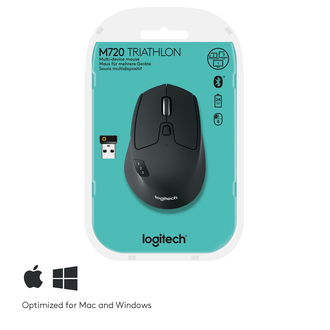 Mit der M720 Triathlon-Maus arbeiten Sie auch bei Verwendung mehrerer Geräte produktiv. Sie wechseln nahtlos zwischen drei Computern und durchfliegen Dokumente und Webseiten durch hyperschnelles Scrollen. Dank der hohen Energieeffizienz können Sie diese Bluetooth®- und Unifying-Maus mit einer einzigen Batterie vom Typ AA 24 Monate lang nutzen. All diese großartigen Eigenschaften sind in einer mittelgroßen Maus verpackt, die bequem in Ihrer Hand liegt.