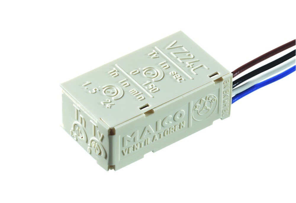 Zeitschalter VZ 24 C, Verzögerungszeitschalter 0-150 s, Nachlaufzeit 1,5-24 min., Verzögerungszeitschalter zur Steuerung der Einschaltverzögerung und Nachlaufzeit von Ventilatoren. Betätigung über handelsübliche Schalter möglich. Schutzart IP40, Maximalbelastung 1,25 A, max. Umgebungstemperatur 50 °C, Breite x Höhe x Tiefe 20 x 13 x 35 mm.