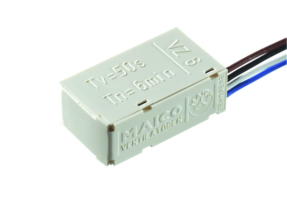Verzögerungszeitschalter VZ6, zur Steuerung der Einschaltverzögerung und Nachlaufzeit von Ventilatoren, Betätigung über handelsübliche Schalter möglich. Störfest gemäß EN 61000-4-5 (bei 1000 V bis 4000 V). Bei Bedarf zusätzliche Entstörmaßnahmen treffen (L-, C- oder RC-Glieder, Schutzdioden, Varistoren). Prüfzeichen: VDE. Einschaltverzögerung 50 s, Nachlaufzeit 6 min.