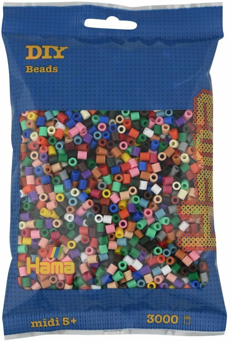 Beutel mit 3000 HAMA-Perlen im Vollton-Mix: 22 Farben (Weiß, Creme, Gelb, Rot, Orange, Hellrot, Lila, Blau, Hellblau, Grün, Hellgrü n, Braun, Grau, Schwarz, Rotbraun, Hellbraun, Hautfarbe, Beige, Olivgrün, Violettrot, Maulbeer, Türkis). Ab 5 Jahren.