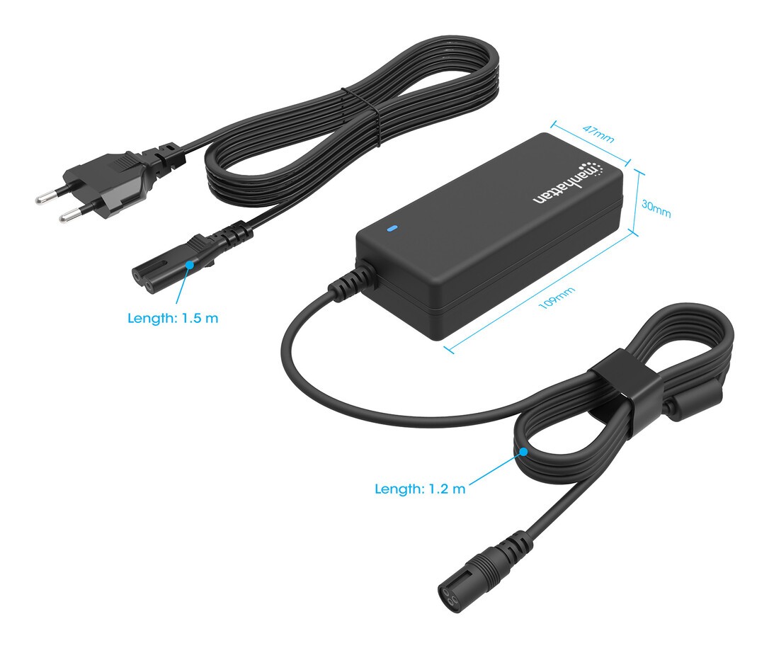 Manhattan 180962. Zweck: Laptop, Netzteiltyp: Drinnen, Eingangsspannung: 110 - 240 V. Produktfarbe: Schwarz, Gehäusematerial: Kunststoff. Konformitätsbescheinigungen: CE, ETL, REACH, RoHS, UKCA. Kabellänge: 2,7 m, Breite: 110 mm, Tiefe: 48 mm. Verpackungsbreite: 185 mm, Verpackungstiefe: 50 mm, Verpackungshöhe: 145 mm