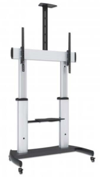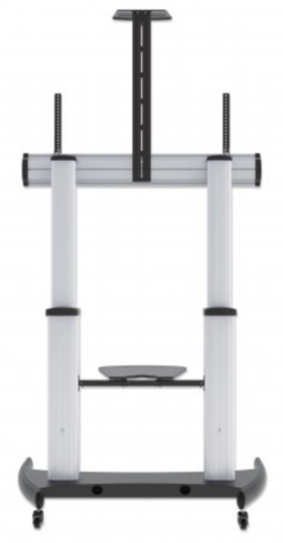 Manhattan Premium Multimedia TV-Ständer auf Rollen mit besonders hoher Traglast , Aluminiumkonstruktion, für Bildschirme von 60" bis 100" und bis zu 100 kg, -10 bis 5° neigbar, höhenverstellbar, Fachböden für Kamera und AV-Zubehör, silber und schwarz, 100 kg, 152,4 cm (60"), 2,54 m (100"), 1000 x 600 mm, Höhenverstellung, Silber