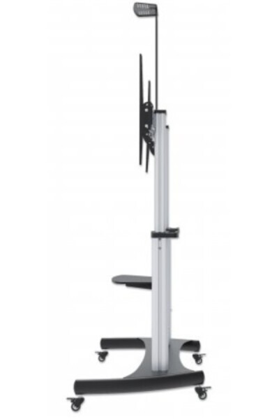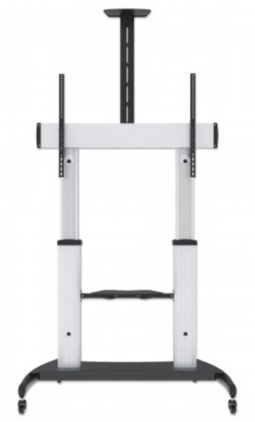Manhattan Premium Multimedia TV-Ständer auf Rollen mit besonders hoher Traglast , Aluminiumkonstruktion, für Bildschirme von 60" bis 100" und bis zu 100 kg, -10 bis 5° neigbar, höhenverstellbar, Fachböden für Kamera und AV-Zubehör, silber und schwarz. Höchstgewichtskapazität: 100 kg, Minimum Bildschirmgröße: 152,4 cm (60"), Maximale Bildschirmgröße: 2,54 m (100"), Minimale VESA-Halterung: 400 x 400 mm, Maximale VESA-Halterung: 1000 x 600 mm. Höhenverstellung, Neigungswinkelbereich: -10 - 5°. Produktfarbe: Silber