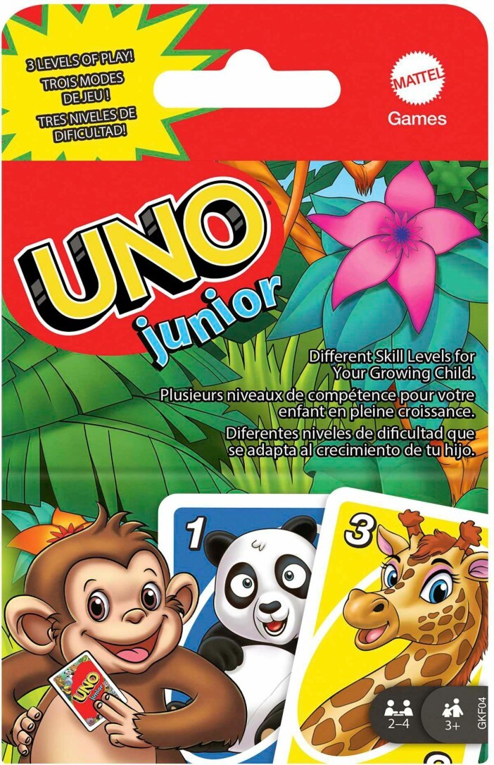 Dieses vereinfachte UNO Kartenspiel für jüngere Spieler kann mit mehreren Schwierigkeitsgraden gespielt werden und wächst so mit den Kindern mit. Die Karten sind für jede Zahl von 0 bis 8 mit liebenswerten Zootieren gestaltet, sodass schon Kinder ab 3 Jahren die passende Karte finden. Da das Spiel mit drei verschiedenen Schwierigkeitsgraden gespielt werden kann, hält es Schritt mit der kindlichen Entwicklung. Die Spieler versuchen, so schnell wie möglich all ihre Karten so abzulegen, dass sie zu der Karte passen, die oben auf dem Stapel liegt entweder nach Farbe oder nach Tier bzw. Zahl. Ganz wichtig: Wer nur noch eine Karte auf der Hand hat, muss ''UNO! rufen. Abweichungen in Farbe und Gestaltung vorbehalten.