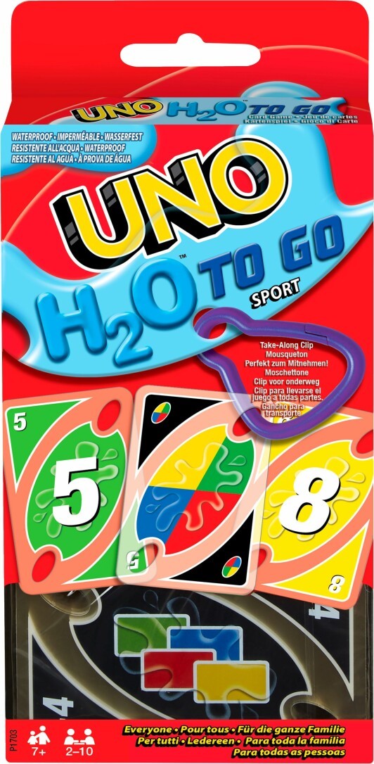 Ab jetzt ist UNO immer mit dabei! Die robusten 108 Kunststoffkarten sind wasserfest und schmutzabweisend und somit ideal geeignet für ein UNO- Spiel am Strand. Der praktische Karabinerhaken hält die Karten zusammen und lässt sich an Gürtel, Rucksack oder Strandtasche anbringen, sodass dieses UNO-Spiel immer griffbereit ist. Also: UNO-Spiel einpacken, und los geht s! Für 2-10 Spieler