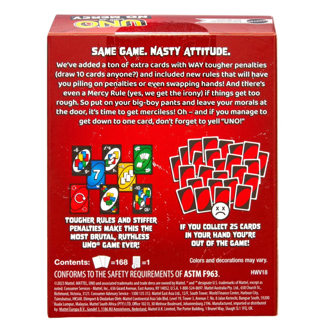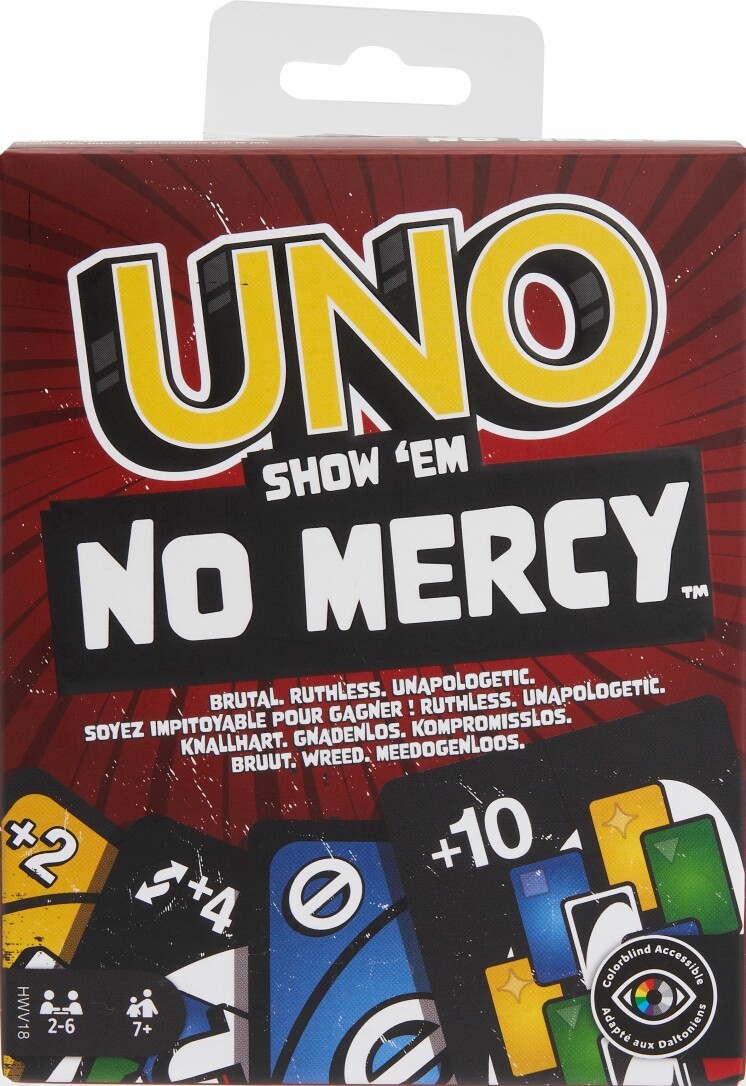 UNO Show em No Mercy ist das bisher brutalste UNO-Spiel! Es hat zahlreiche zusätzliche Karten mit DEUTLICH härteren Strafen (möchte jemand 10 Karten ziehen?) und neuen Regeln, bei denen die Spieler mehr Karten stapeln, austauschen und ziehen als je zuvor! Und es gibt sogar eine Gnadenregel (ja, das ist wirklich ironisch), wenn es zu hart wird. In dieser gnadenlosen Version des klassischen Spiels gibt es zwei Möglichkeiten, um zu gewinnen: alle Karten loswerden ODER alle anderen Spieler aus dem Spiel eliminieren! Ganz wichtig: Wer nur noch eine Karte auf der Hand hat, muss UNO! rufen.