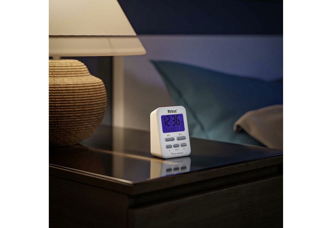 Digitaler Funkwecker. Anzeige von Stunden, Minuten und Sekunden. Vollautomatische Einstellung. 2 Weckzeiten mit Schlummerfunktion. Anzeige der Innentemperatur in °C oder °F. Beleuchtung auf Knopfdruck. Wochentagsanzeige (in 7 Sprachen). 12-/24 Std. – Anzeige. Zeitzoneneinstellung
