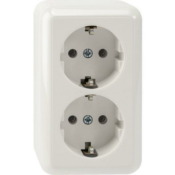 Schuko-Doppel-Steckdose für Aufputz-Montage, mit Schraubbefestigung und Schraubklemmen.