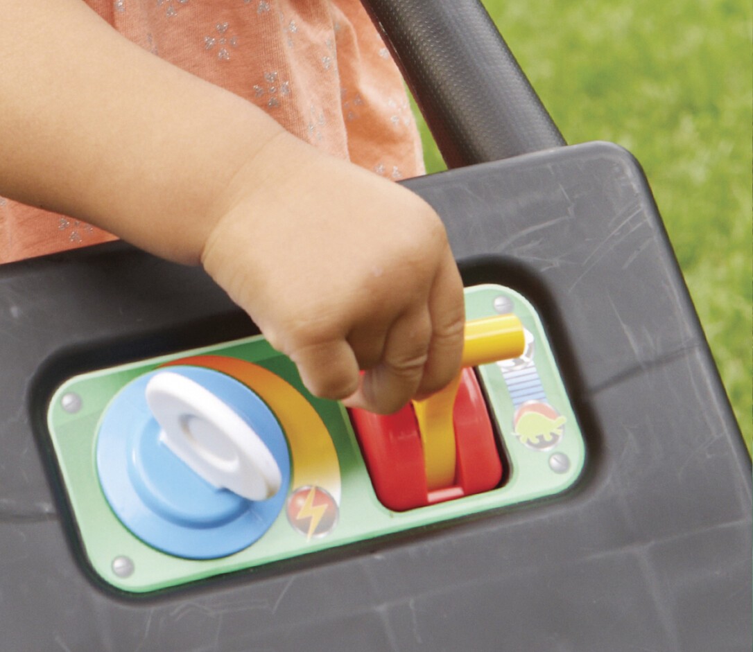 Der Rasenmäher mit Anlass- und Motorengeräusch funktioniert ganz ohne Batterien! Ein verstellbarer Gashebel, bunte, hüpfende Kugeln im Grasauffangbehälter und Benzinkanister sorgen für realistischen Gartengestaltungs-Spiel-Spaß.