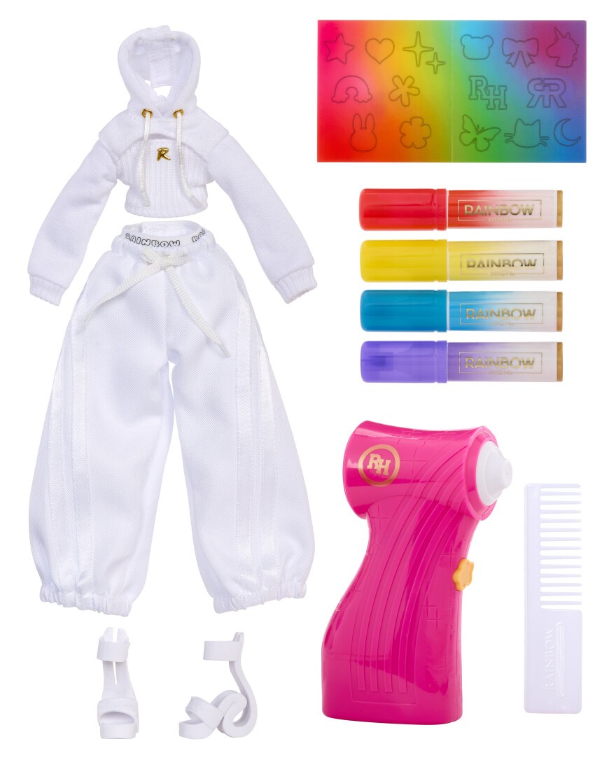 Ein neuer Charakter in einem wunderschönen weißen Outfit mit langem, weißem Haar. Mit dem innovativen Airbrush-Tool lassen sich individuelle Farbdesigns mühelos auftragen. Alternativ können die vier mitgelieferten Marker in Regenbogenfarben verwendet werden, um Kleidung, Schuhe und Haare direkt zu gestalten. Die Farben sind auswaschbar, sodass immer wieder neue Looks kreiert werden können. Eine Stickerschablone erleichtert das Auftragen von Formen.