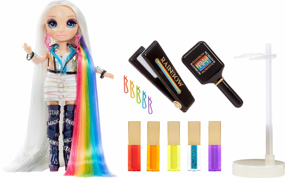 Entdecke die neue Rainbow Surprise Hair Play Rainbow Doll mit platinfarbenen Haaren und ganz vielen Überraschungen! Eine bezaubernde, voll bewegliche Regenbogen-Fashion-Puppe mit langen Wimpern, stylishem Outfit und langen Haaren zum stylen. Verwende das mitgelieferte Haar-Zubehör und die Haare der Puppe verfärben sich! Mit ganz viel Zubehör und Accessoires!