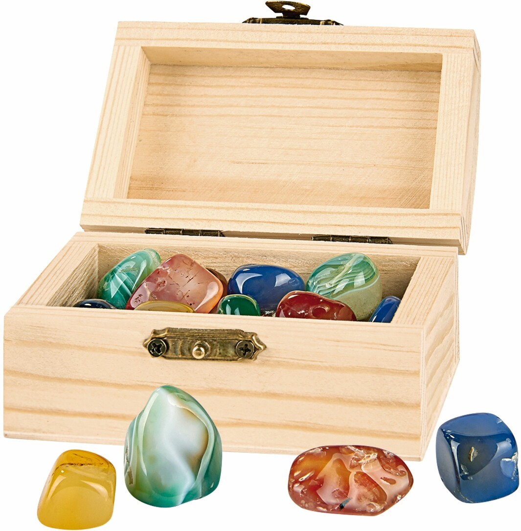 Jeder kleine Pirat braucht eine Schatztruhe, um dort seine wertvollsten Kleinigkeiten aufzubewahren. Diese Schatzkiste hat es in sich, denn sie ist prall gefüllt mit 24 echten Mineralien. Die Truhe aus Holz verbirgt Rosenquarz, Amethyst, Pyrit und verschiedenfarbige Achate - ein kunterbunter Schatz für echte Seeräuber. Bei der Piraten-Kindergeburtstagsparty darf die Schatztruhe auch nicht fehlen. Die Suche nach einem Piratenschatz ist für die kleinen Partygäste garantiert das Highlight der Feier. Und wenn der Schatz gefunden wurde, darf sich jedes Kind sein Lieblingsmineral mit nach Hause nehmen und hat so ein tolles Andenken an einen unvergesslichen Tag. + Schatztruhe aus Holz + enthält 24 echte Minerale: Rosenquarz, Amethyst, Pyrit und verschiedenfarbige Achate + inklusive Infoblatt zu den enthaltenen Mineralien