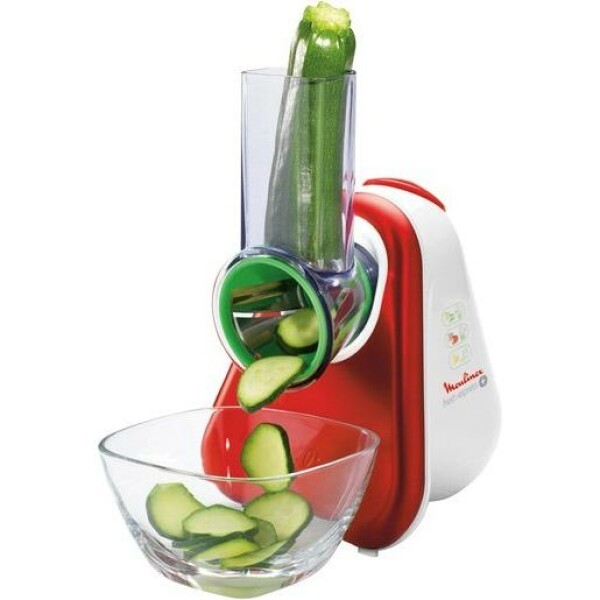 Zerkleinerer, Leistung: 150 Watt, Leistungsabstufungen: 1, Serien: Moulinex Fresh Express, Moulinex Red Ruby Collection, Ausstattung: Kabelaufwicklung, Gehäusematerial: Kunststoff/ Sonstiges: elektrisches Schnitzelwerk, fünf Trommeleinsätze: hellgrün zum feinen Schneiden, rot zum groben Raspeln, orange zum feinen Raspeln, dunkelgelb zum Reiben (Parmesan, Nüsse u.a.), hellgelb zum Kartoffelreiben, einfache Entnahme der Trommeln, weiter Auswurf, Funktionen: schneiden, reiben, raspeln