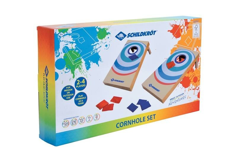 Das neue Schildkröt Cornhole Set (auch bekannt als Bean Bag oder Sackloch) ist ein lustiges Freizeitspiel für 2-4 Spieler, das Geschicklichkeit und Treffsicherheit erfordert. Bei dem Trendspiel aus Amerika müssen die 4 roten und 4 blauen Sandsäckchen in das Loch der beiden schrägen Zielflächen (52 x 30 x 14cm) geworfen werden. Das Cornhole Set enthält 2 Holzbretter mit ausklappbaren Beinen sowie 8 mit Sand gefüllte Stoffsäcke (4x Rot / 4x Blau). Der Treffer im Loch zählt 3 Punkte, ein Treffer auf der Plattform ergibt nur einen Punkt. Ideales Spiel mit Freunden im Freien, das an Wochenenden oder im Urlaub überall mitgenommen werden kann. Hergestellt aus MDF-Holz. Lieferung im Farbkarton. ACHTUNG! Nicht für Kinder unter 3 Jahren geeignet. Artikel enthält Kleinteile, Verschluckungs- und Erstickungsgefahr. Über Schildkröt: Die über 100 Jahre alte deutsche Marke Schildkröt gilt als Erfinder des Tischtennisballs. Heute bietet Schildkröt neben Tischtennis auch eine sehr umfangreiche Funsport-, Rollsport- und Fitness-Kollektion an und gilt in gewissen Bereichen als Marktführer. Die Produktentwicklung erfolgt ausnahmslos in Deutschland. Die weltweiten Produktionsstätten werden streng überwacht und genügen höchsten Sozialstandards.