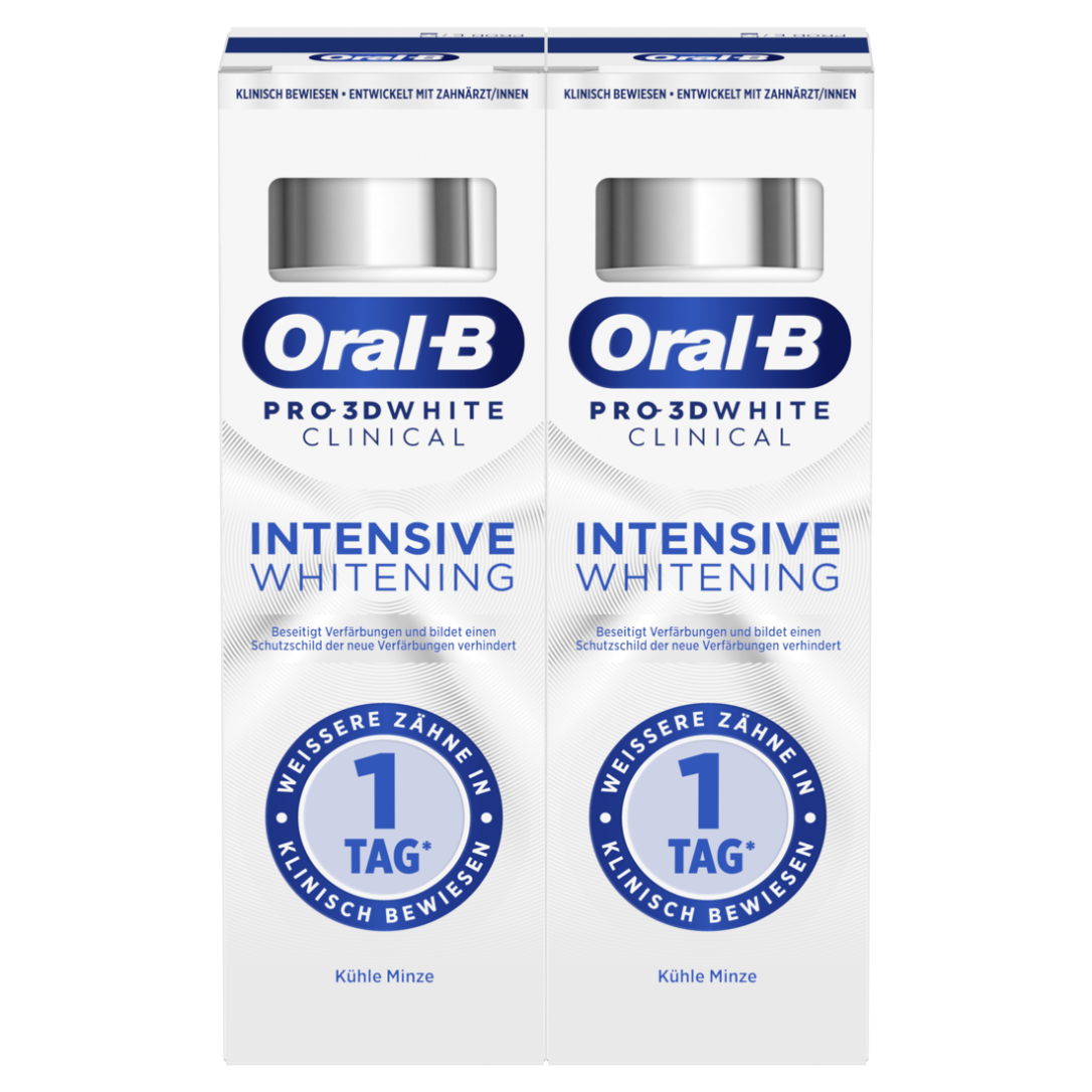 Die Oral-B Pro 3D White Clinical Intensive Whitening Zahnpasta sorgt klinisch bewiesen für weißere Zähne in nur einem Tag durch die Entfernung von Oberflächenverfärbungen. Die beste Whitening Zahnpasta von Oral-B mit einzigartiger Ionic-Technologie: Sie löst Verfärbungen ohne Schrubben, entfernt Verfärbungen mit Ionic Whitening, schützt die Zähne vor zukünftigen Verfärbungen und ist für empfindliche Zähne geeignet.