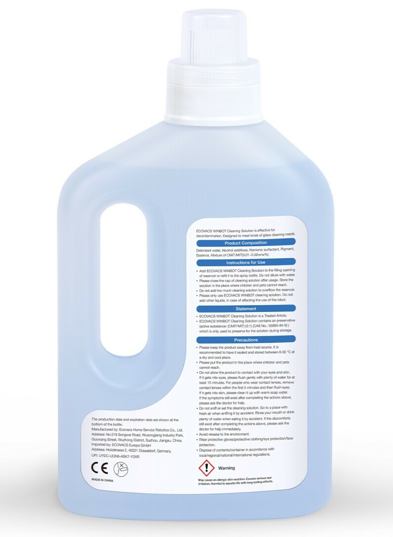 Die Reinigungslösung W-SO01-0007 von ECOVACS ist mit allen WINBOT Fensterreinigern kompatibel. Man braucht nur die gebrauchsfertige WINBOT-Reinigungslösung in den Wassertank oder die Sprühflasche geben, ohne sie mit Wasser verdünnen zu müssen..