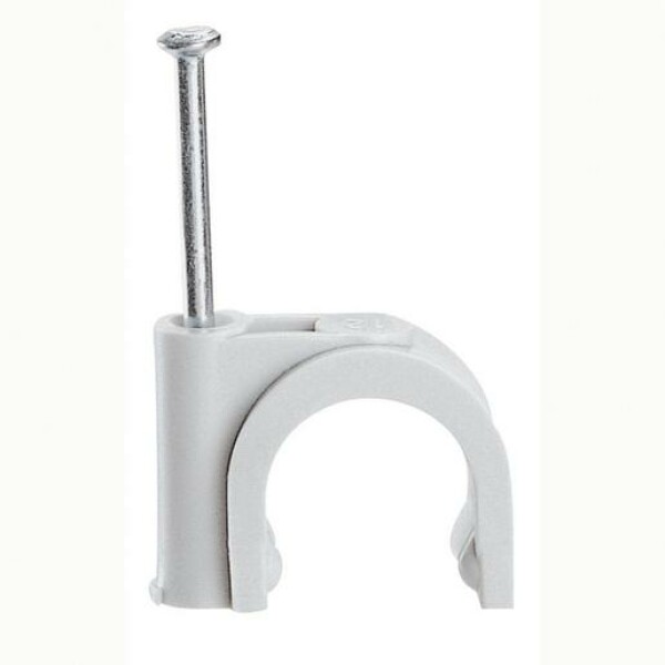 Nagelschelle aus schlagfestem Kunststoff mit eingestecktem Stahlnagel für Rundkabel Ø: 22 mm, Nagelstärke Ø: 2,5 mm, Nagellänge Ø: 50 mm, Farbe: grau.