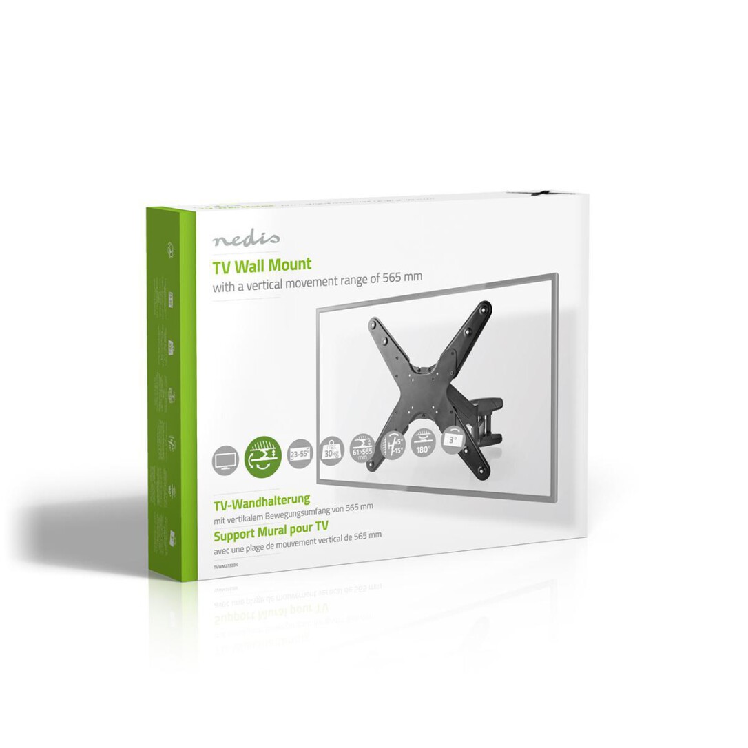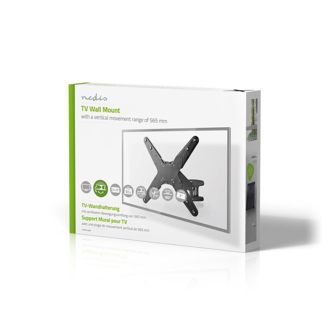 Nedis Schwenkbare TV-Wandhalterung / 23 - 55 " / maximal unterstützes Bildschirmgewicht: 30 kg / Vertikale Bewegung: 0-282 mm / Minimaler Wandabstand: 61 mm / Maximaler Wandabstand: 565 mm / kippbar / drehbar / 3 Drehpunkt(e) / ABS / Stahl / Schwarz