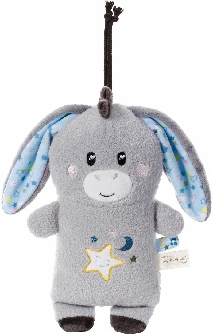 Die My First NICI Einschlafhilfe Littledoo ist intelligentes Plüschtier und Einschlafhilfe in einem - ein echtes Multitalent. Der kuschelige Esel mit dem freundlichen Gesicht, den langen Eselsohren und der hochwertigen Mond &, Sterne Stickerei auf dem Bäuchlein ist aus grauem, kuschelweichem NICI Plüsch gefertigt. Ein Klettverschluss auf dem Rücken des süßen Langohrs sichert das herausnehmbare Licht- und Soundmodul, das über ein USB C Kabel im Handumdrehen aufgeladen werden kann. Mit seinem dynamischen Licht in verschiedenen Farben, beruhigenden Geräuschen und sanften Schlafmelodien schafft Littledoo eine entspannende Atmosphäre im Kinderzimmer, die dem Baby beim Einschlafen hilft. Der integrierte Smart Cry Sensor reagiert auf die Geräusche des Kindes und aktiviert automatisch die von den Eltern voreingestellte Beruhigungsfunktion - so bekommt der kleine Schatz immer die Unterstützung, die er braucht. Aus superweichen Materialien gefertigt, vermittelt Littledoo ein Gefühl von Geborgenheit und Sicherheit. Die Kombination verschiedener Funktionen fördert nicht nur das Durchschlafen, sondern auch die motorischen und sensorischen Fähigkeiten der Allerkleinsten. Dank zweier Bändchen, lässt sich die kuschelige Einschlafhilfe ganz einfach am Bettchen, Kinderwagen oder Babyschale befestigen. Mit Littledoo, dem perfekten Schlafbegleiter, schenken Sie Ihrem Baby und sich selbst die Freude an ruhigen Nächten und entspannten Einschlafritualen - eine wunderbare Geschenkidee zur Geburt oder Taufe.