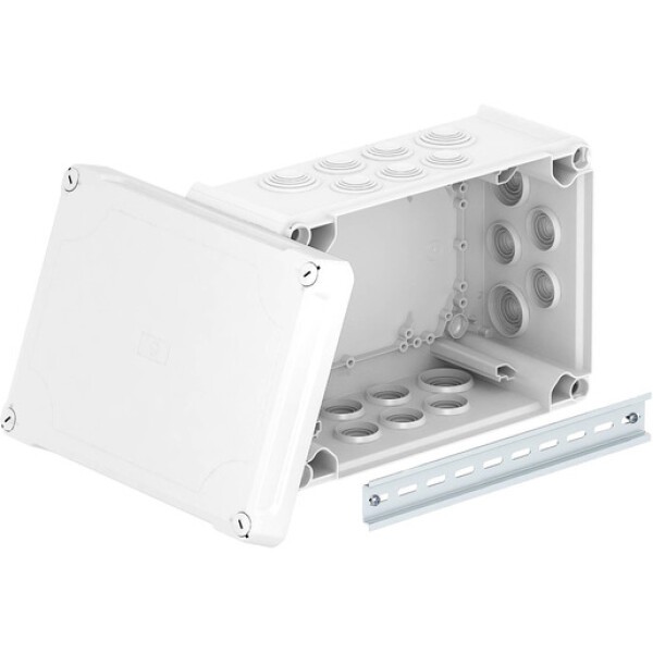 Die Kabelabzweigkästen bestehen aus thermoplastischem Kunststoff. Die Kastenunterteile sind aus schlagfestem Polypropylen, der Kastendeckel wird aus äußerst widerstandsfähigem, schlagfestem Polykarbonat hergestellt. Dies ist auch an der hohen Schlagfestigkeit von IK 10 bei -5°C zu erkennen. Durch den hohen Deckel wird deutlich mehr Verdrahtungsraum geschaffen. Hiermit schafft OBO die Möglichkeit für den Einbau und Schutz von Drucktastern, Reihenklemmen, Unterbringung von Steuerungssensoren, Schaltern und elektronischen Geräten in der Gehäuse- und Installationstechnik. Zusammen mit der Befestigungsplatte ist er ein idealer Begleiter bei Sichtmontage.
