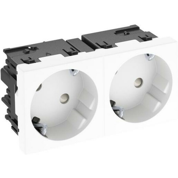 Schutzkontakt-Steckdose 2-fach 33°, mit erhöhtem Berührungsschutz, mit Steckklemmen, 2polig, 16 A, 250 V~, mit Verbindungsklemmen nach IEC 60884-1. Zur Installation in Rapid 45 Kanälen, Geräteeinbaukanälen, Installationssäulen, UnterflurSystemen und Deskboxen.