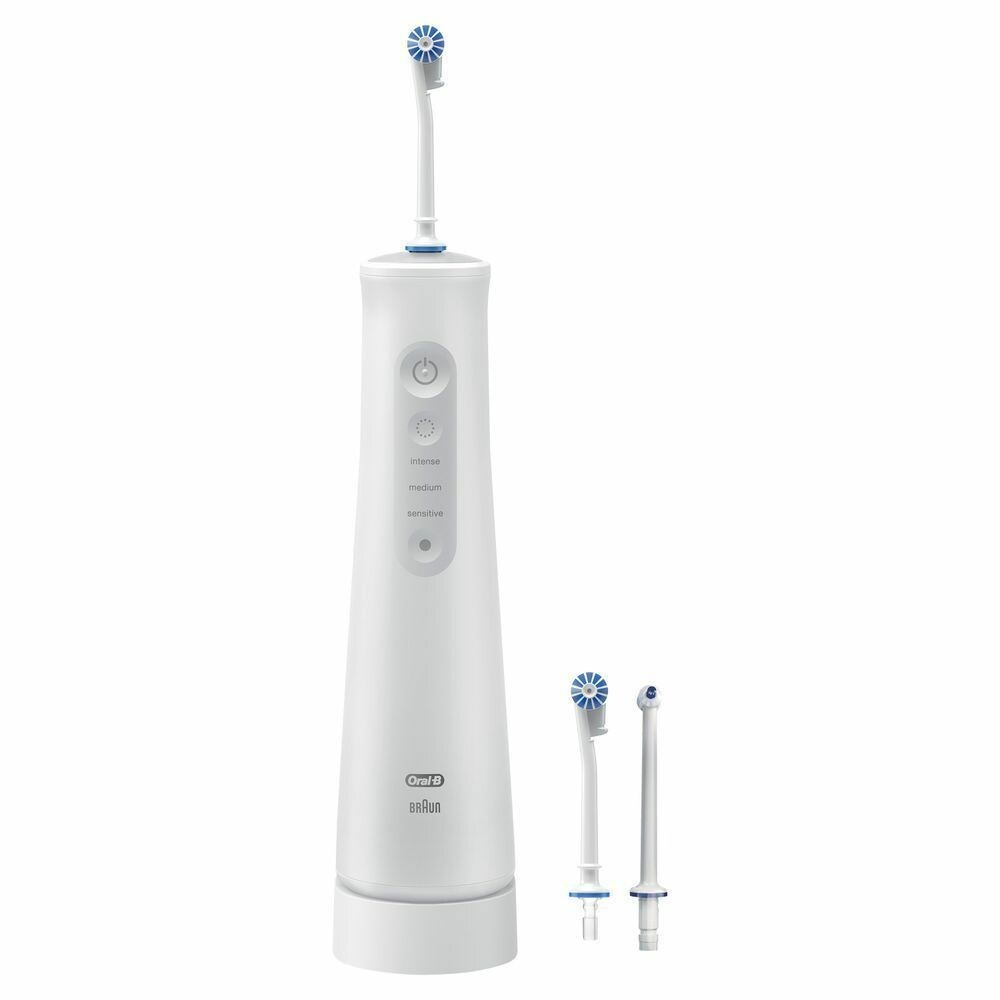 Prüfen Sie das Kabel regelmäßig auf Beschädigungen. Falls das Kabel beschädigt ist, bringen Sie es in ein Servicecenter des Herstellers. Beschädigte oder nicht funktionstüchtige Geräte dürfen nicht länger benutzt werden. Die Munddusche ist nicht für die Anwendung durch Kinder unter 8 Jahren geeignet. Dieses Gerät ist nicht für den Gebrauch von Kindern oder Menschen mit eingeschränkten körperlichen, sensorischen oder geistigen Fähigkeiten geeignet, sofern sie nicht von einer für ihre Sicherheit verantwortlichen Person dabei beaufsichtigt werden. Grundsätzlich empfehlen wir, das Gerät außerhalb der Reichweite von Kindern aufzubewahren. Kinder sollten beaufsichtigt werden, um sicherzustellen, dass sie nicht mit dem Gerät spielen. Falls das Produkt herunterfällt, sollte der Bürstenkopf vor dem nächsten Gebrauch ausgetauscht werden, auch wenn kein sichtbarer Schaden entstanden ist. Achten Sie beim Aufstellen und Aufbewahren darauf, dass das Produkt nicht in eine Wanne oder ein Waschbecken fallen oder hineingezogen werden kann. Legen Sie das Ladegerät weder in Wasser noch in andere Flüssigkeiten. Greifen Sie nicht nach dem Ladegerät, wenn es ins Wasser gefallen ist. Ziehen Sie unverzüglich den Stecker. Nehmen Sie keine Veränderungen an dem Produkt vor und reparieren Sie es nicht. Dies kann zu Feuer, Stromschlag oder Verletzungen führen. Wenden Sie sich bezüglich Reparaturen an Ihren Fachhändler oder kontaktieren Sie ein Oral-B Servicecenter. Öffnen Sie das Gerät nur zum Herausnehmen und Entsorgen des Akkus. Wenn Sie die Batterie zum Entsorgen herausnehmen, achten Sie darauf, die positiven (+) und negativen (–) Pole nicht zum Kurzschluss zu bringen. Stecken Sie keine Gegenstände in Öffnungen am Gerät oder Ladegerät. Berühren Sie den Stecker nicht mit nassen Händen. Dies kann zu einem elektrischen Schlag führen. Halten Sie beim Herausziehen des Kabels immer den Stecker fest und nicht das Kabel. Nutzen Sie das Produkt nur für den hier beschriebenen Verwendungszweck. Nutzen Sie kein Zubehör, das nicht vom Hersteller empfohlen ist. Bitte wenden Sie sich vor der Anwendung an Ihren Zahnarzt, falls Sie sich in zahnmedizinischer Behandlung befinden.