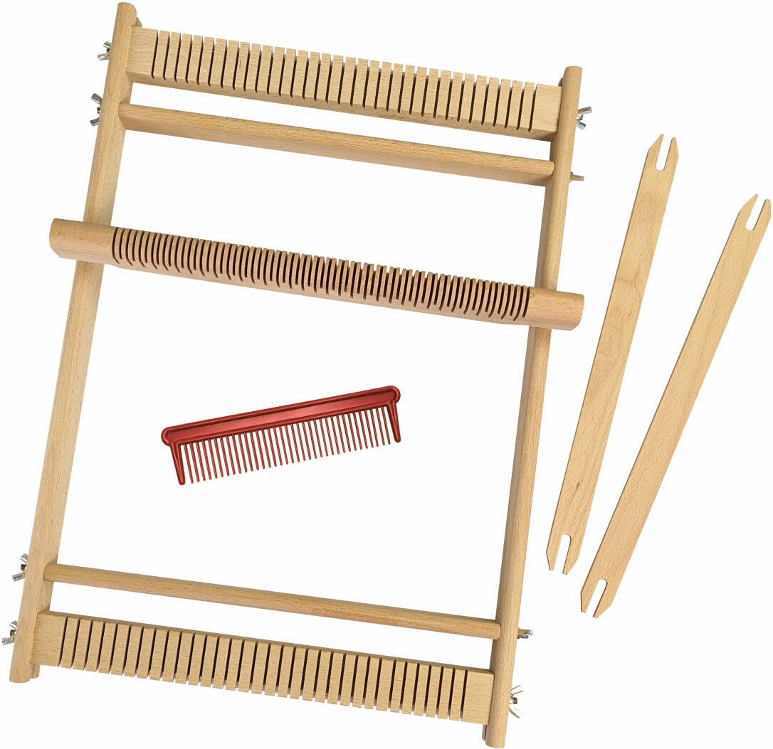 Webrahmen aus Buchenholz im Beutel, 30 mm Durchmesser, mit 2 Schiffchen und 1 Kamm, unmontiert mit Flügelmuttern.