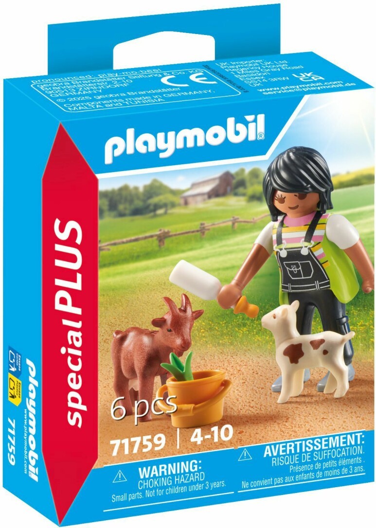 PLAYMOBIL Special Plus Frau mit Ziegen. Die Bäuerin füttert das Ziegenjunge mit einer Milchflasche während Mama Ziege ihr Futter im Eimer vertilgt.