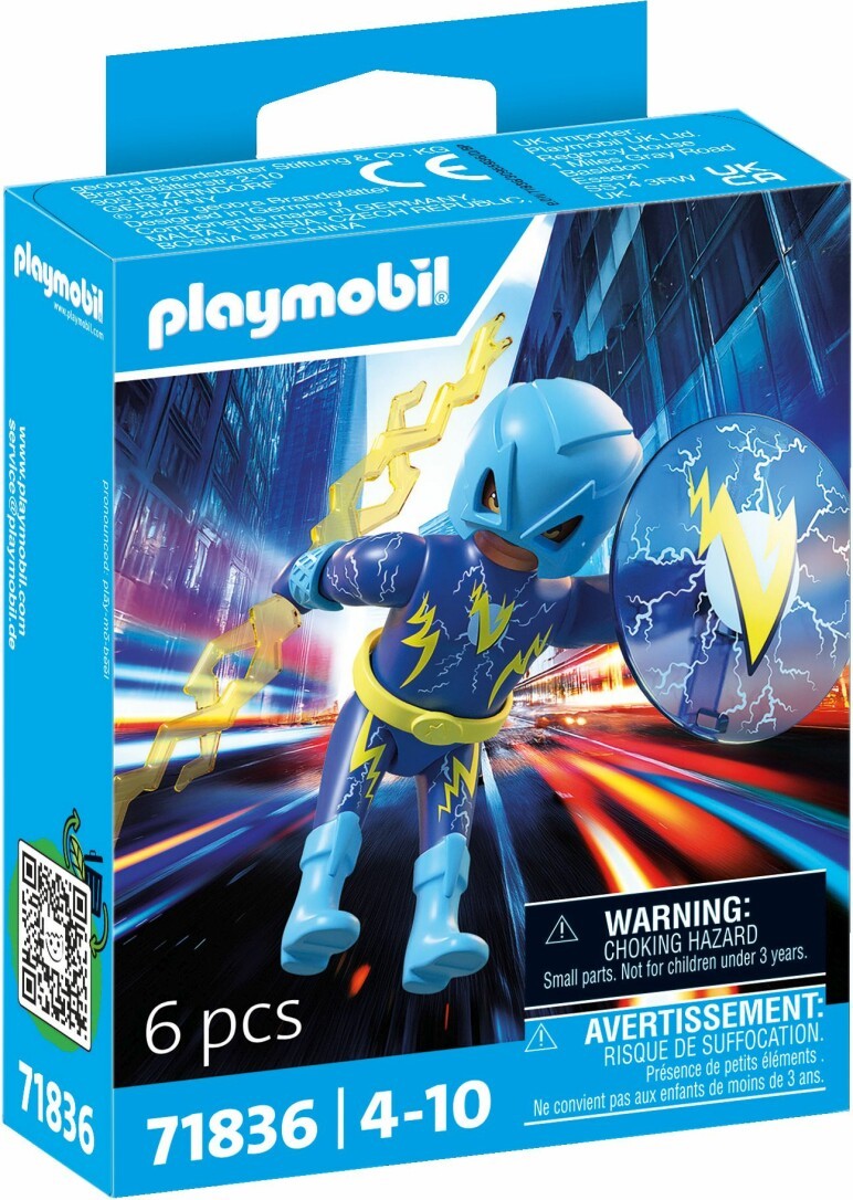 PLAYMOBIL Heroes: Blue Voltage Der Blitz-Held Einer von vier Sammelhelden der PLAYMOBIL Heroes-Serie, mit denen du deine Helden- und Schurkenriege erweitern kannst! Der energiegeladene Blitz-Held Blue Voltage beeindruckt mit seinen blitzschnellen Reflexen und der Fähigkeit, Elektrizität zu erzeugen und daraus Schutzschilde zu formen. Mit seiner wechselbaren Maske kann er unerkannt bleiben, während er Gegner mit seinem Speer-Blitz präzise trifft.