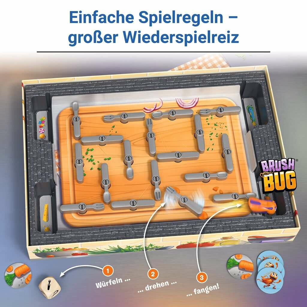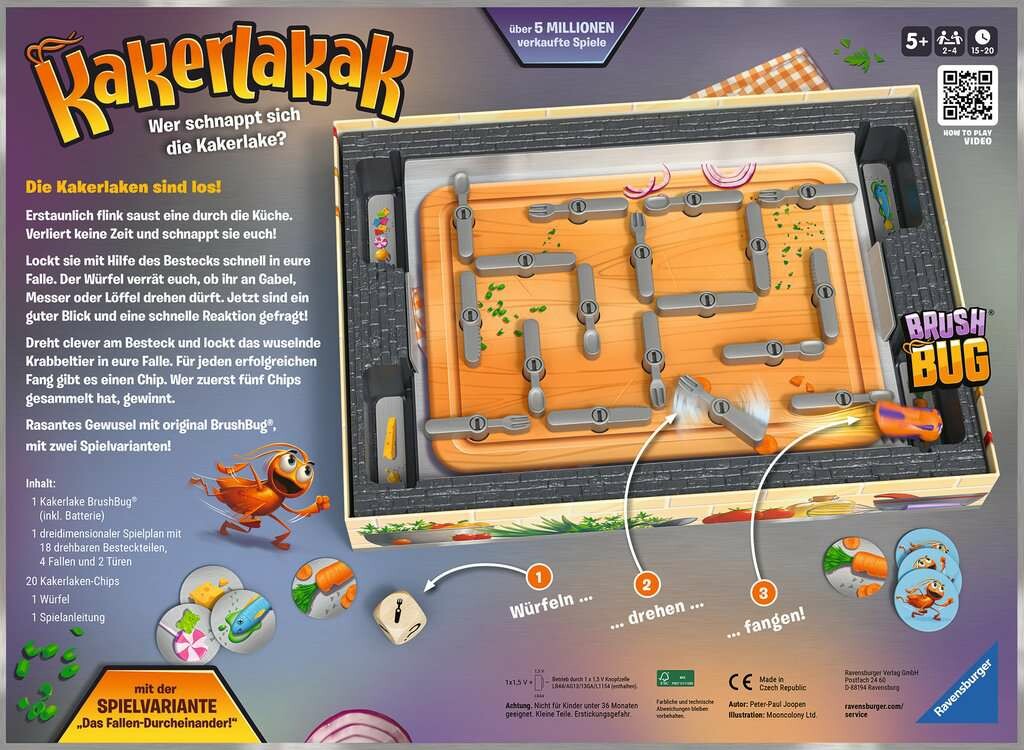 Flink saust die Kakerlake durch die Küche! Jetzt heißt es, keine Zeit zu verlieren. Wer kann sich das herumwuselnde Insekt mit Hilfe des ausliegenden Bestecks schnappen? Der Würfel entscheidet, ob Gabel, Messer oder Löffel gedreht werden. Wird das Besteck geschickt gedreht, kann die Kakerlake in einer Falle gefangen werden. Wem die Kakerlaken-Falle gehört, bekommt einen Chip. Die Jagd auf das lichtscheue Krabbeltier gewinnt, wer zuerst fünf Chips ergattern konnte!Das Ausgangslabyrinth kann bei jeder neuen Spielrunde variiert werden letztendlich beweist die Kakerlake aber immer wieder, dass sie einen eigenen Kopf hat und ganz anders abbiegt, als erwartet! Kakerlakak ist eine rasante und lustige Jagd für clevere Fallensteller mit original HEXBUG® nano. Ausgezeichnet mit mehreren Preisen, unter anderem mit dem Deutschen Spielepreis als Bestes Kinderspiel 2013.