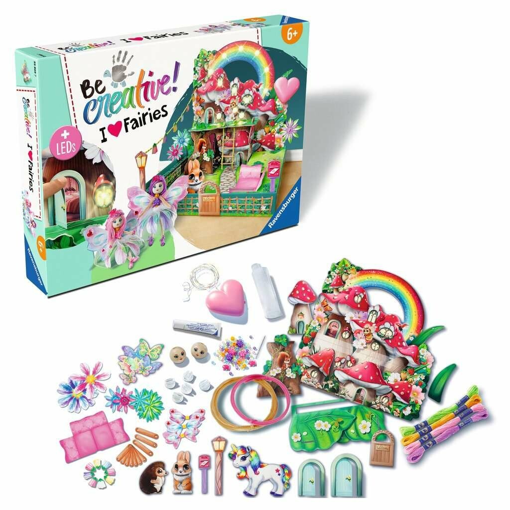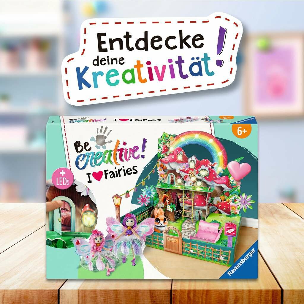 Mit dem BeCreative-Bastelset Feenwelt von Ravensburger können Kinder ab 6 Jahren eine eigene kleine Feenwelt mit zwei zauberhaften Bewohnerinnen basteln. Eine LED Lichterkette bringt das ganze zum Strahlen. Und am Ende stehen Freude, Stolz und ein Erfolgserlebnis, das die Lust am Weiterbasteln weckt. Die gebastelten Objekte bringen Spaß beim Basteln und anschließenden Spielen.Die BeCreative-Sets von Ravensburger inspirieren Kinder zum Selbermachen! Das Produkt enthält alles was benötigt wird, um eine leuchtende Feenkulisse mit vielen Details und zwei bezaubernden Feen zu basteln. Das Besondere dabei: Nur die eine Hälfte der Feenwelt ist sichtbar! Während die Unterseite der Schachtel zu einem verwunschenen Feengarten wird, bildet die Kulisse die Vorderfront des Feen-Hauses und die Eingangstür ab. An eine Wand gestellt, befindet sich das Innere das Hauses somit im Verborgenen und weckt die Phantasie der Kinder. Was machen die Feen versteckt in ihrem Haus? Und was erleben sie draußen in ihrem magischen Feengarten? Das Set kombiniert viele verschiedene Basteltechniken, mit denen die Kinder ihre Feen und deren Welt frei nach ihren Wünschen gestalten können. Die einfache Anleitung führt dabei von Schritt zu Schritt - der Phantasie sind keine Grenzen gesetzt!