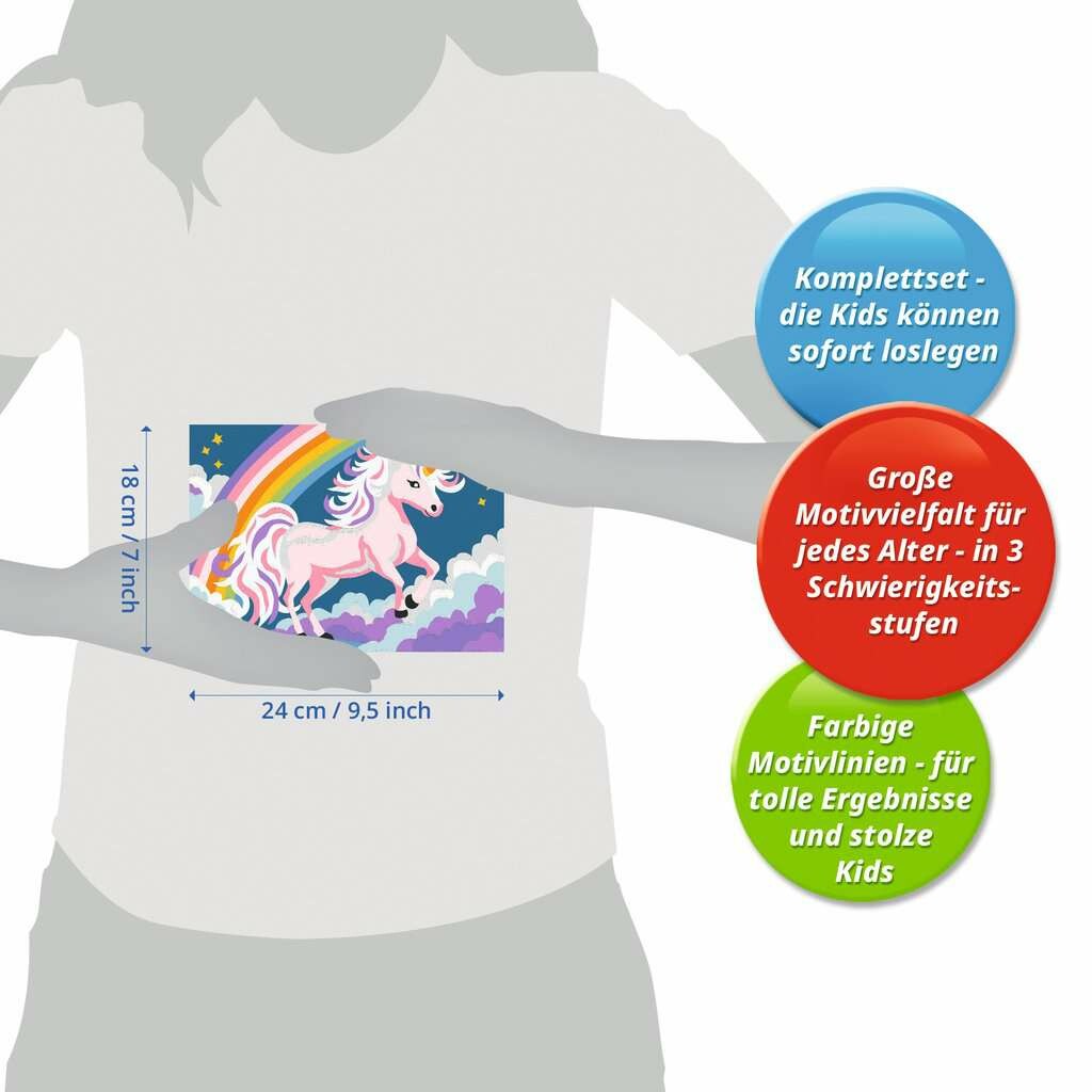 Farbige Motivlinien: Größerer Malspaß & ein schöneres Ergebnis!Dank der farbigen Motivlinien, können die Kinder das ganze Motiv Pinkes Einhorn und die Farben schneller erkennen. Der Pinsel hat eine gute Führung und so entsteht ein perfektes Bild.Die schönen Motive zum Ausmalen sind eine tolle Geschenkidee für Kinder ab 7 Jahren und eine schöne Dekoration. In diesem Malset sind bereits 14 fertig gemischte Acrylfarben enthalten. Verpackungsdesign kann abweichen. Mit Malen nach Zahlen von Ravensburger lernen die Kinder Flächen sorgfältig auszumalen, ihr Maltalent zu verbessern sowie feinmotorische Fähigkeiten zu entwickeln. Am Ende stehen Freude, Stolz und ein Erfolgserlebnis, das die Lust am Weitermalen weckt.Die Motive sind altersgerecht in drei Schwierigkeitsstufen umgesetzt: von einfachen Bildern mit wenigen, großen Malflächen bis hin zu Bildern mit vielen, kleinen Malflächen für Fortgeschrittene.Jedes Malset enthält alles, was Künstler zum Malen brauchen und es ist kein Mischen der Farben notwendig.Das Ravensburger Malen nach Zahlen Programm bietet eine große Motivauswahl für Kinder und Erwachsene.