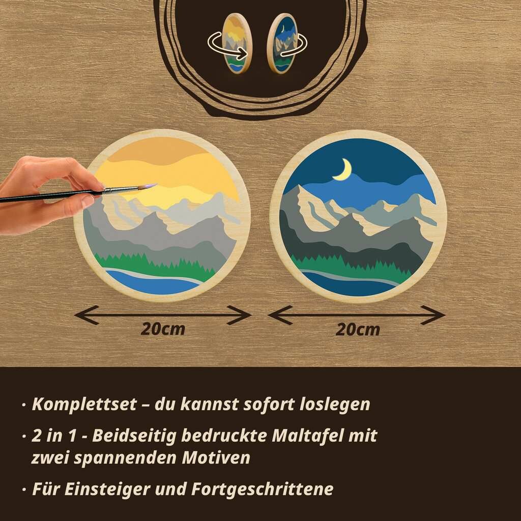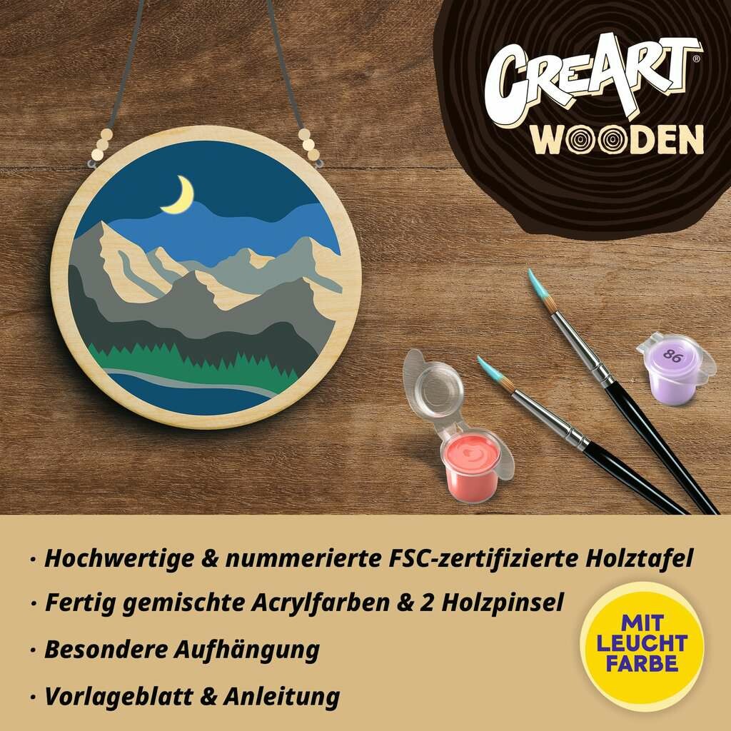 CreArt Malen nach Zahlen auf Holz: die Faszination des Malens nach Zahlen in einer völlig neuen Dimension – auf hochwertigem Holz (Durchmesser 20 cm)! Diese einzigartige Art des Malens verbindet den Charme natürlicher Materialien mit der meditativen Ruhe und Präzision des klassischen Malen-nach-Zahlen-Prinzips. Perfekt für Anfänger und erfahrene Künstler, ab 12 Jahren, bietet unser Malen nach Zahlen auf Holz ein unvergleichliches Erlebnis. - An die Pinsel, fertig, los! Mit unseren All-in One Sets zur selbst kreierten Holz-Deco-Art - 2 Holzpinsel in verschiedenen Stärken machen das Ausmalen flexibel - Der praktische Aufhänger macht das Kunstwerk zum Deko-Element für die Wand - Beim Ausmalen des Motivs Berge entspannen und Stress abbauen! So schön war Malen auf Holz noch nie! - Das Motiv Berge ist auch für Malen nach Zahlen CreArt Einsteigerinnen & Einsteiger geeignet