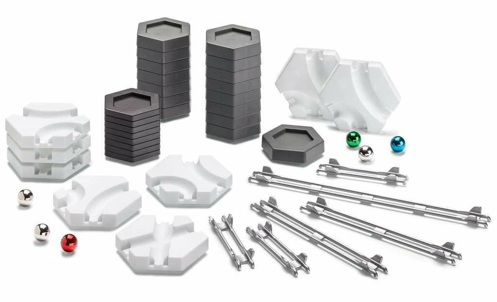 Entwickle mit den Bauelementen einen Action-reichen Parcours, auf dem die Kugeln mit Hilfe von Magnetismus, Kinetik und Gravitation ins Ziel rollen.