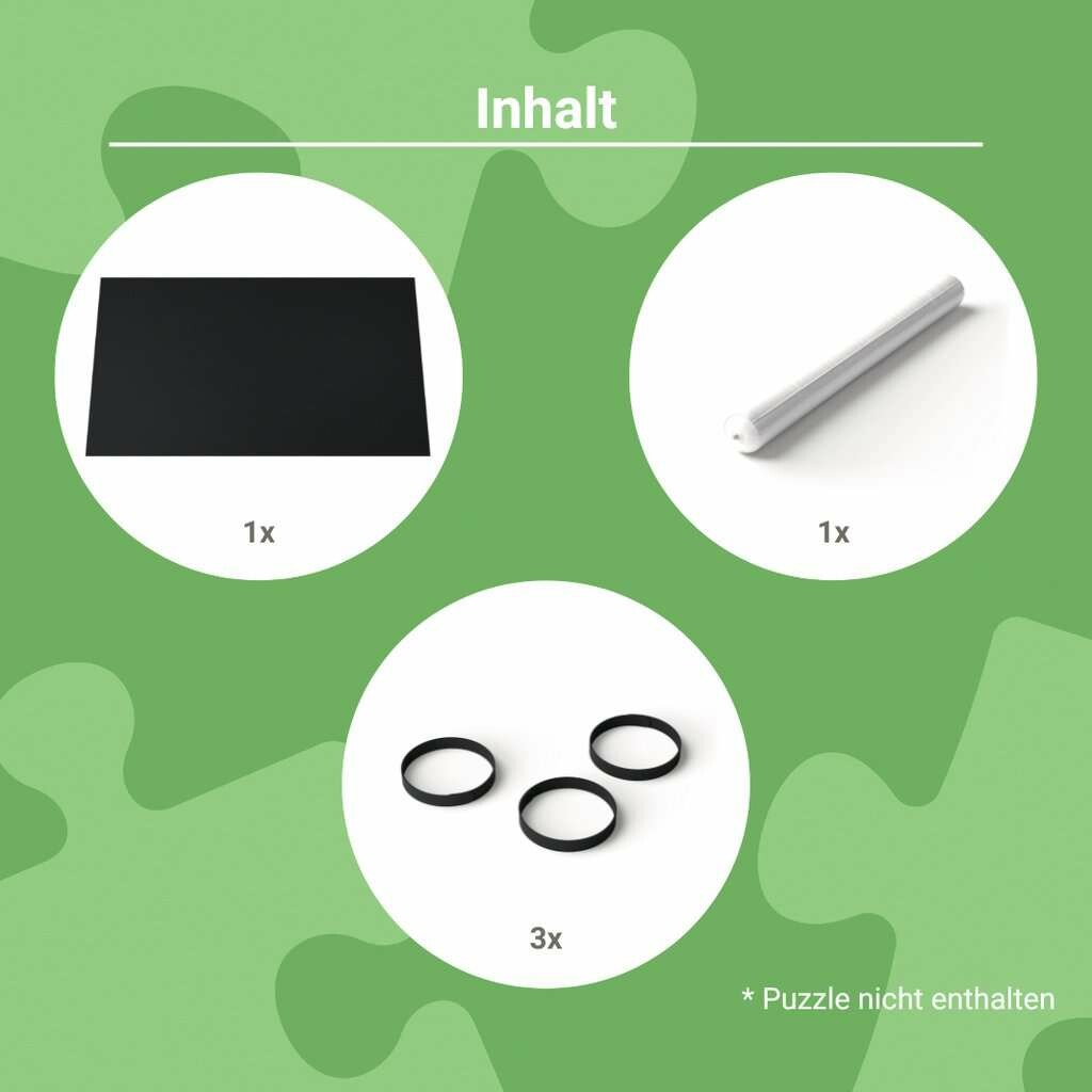 Puzzle aufrollen und sicher aufbewahren. Profi-Zubehör für Puzzles bis 3000 Teile. Mit diesem praktischen Aufbewahrungssystem können Sie Ihre angefangenen und fertigen Puzzles sicher transportieren und platzsparend verstauen. Inhalt: eine rutschfeste Filzunterlage 150x 100 cm, eine aufblasbare Rolle und drei Gummibänder zum Fixieren.