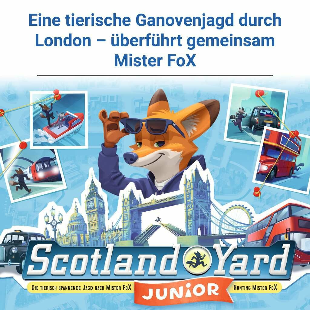 Gemeinsam jagen die tierisch cleveren Detektive den geheimnisvollen Mister FoX kreuz und quer durch London. Mister FoX bewegt sich für alle sichtbar mit Taxi, Bus oder Underground. Doch wohin flieht er als Nächstes? Vorsicht: Er trickst gerne die Detektive aus. Gefangen ist er, wenn sich ein Detektiv gleichzeitig auf dieselbe Station bewegt! Ein tierisch mitreißender Einstieg zu Scotland Yard: einfache Regeln, kurze Spielrunden und spannend bis zum Schluss!Scotland Yard Junior ist eine veränderte und vereinfachte Form des Spiele-Klassikers Scotland Yard für Kinder ab 6 Jahren. Hier spielt es in einer tierischen Themenwelt in London. Mister X wird zum Fuchs Mister FoX , die Detektive sind ein cleveres Team aus Katze und Hund. Bei vier Spielern ist die Waschbärdame RoXi als Komplizin von Mister FoX mit von der Partie. Zuerst zieht der Ganove, indem er das Ticket, dass zu seiner nächsten Station führt, geheim unter dem Tisch in die Hand nimmt. Auch stehenbleiben ist erlaubt. Danach sind beide Detektive an der Reihe. Sie versuchen zu durchschauen, wohin die Flucht von Mister FoX geführt hat. Beim Auflösen wird es jedes Mal spannend: Wurde er geschnappt, erhalten die Detektive einen X-Chip, bei erfolgreicher Flucht Mister FoX. Wer seine Tafel zuerst mit X-Chips füllen konnte, gewinnt die Verfolgungsjagd!