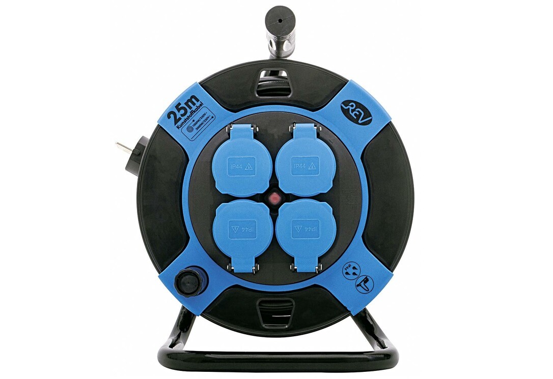 Trommelscheiben aus schlagfestem Kunststoff, 4 spritzwassergeschützte Schutzkontaktsteckdosen, VDE, ÖVE, Gummi-Schutzkontaktstecker, Thermoschalter als Überhitzungsschutz mit integrierter Wiederanlaufsperre, mit erhöhtem Berührungsschutz, Ständer aus lackiertem Stahlrohr, federnde Lagerung des Trommelkörpers, zur vorübergehenden Verwendung im Freien, IP 44, Feststellbremse, verschiebbar, Kabelclip zur Leitungsfixierung, REV-Qualitätsleitung H05VV-F 3G1,5 - VDE-HAR, 25 m PVC Kabel, drehbarer Wickelgriff und komfortabler Tragegriff, technische Daten: 230 V ~, max. 3000 Watt.