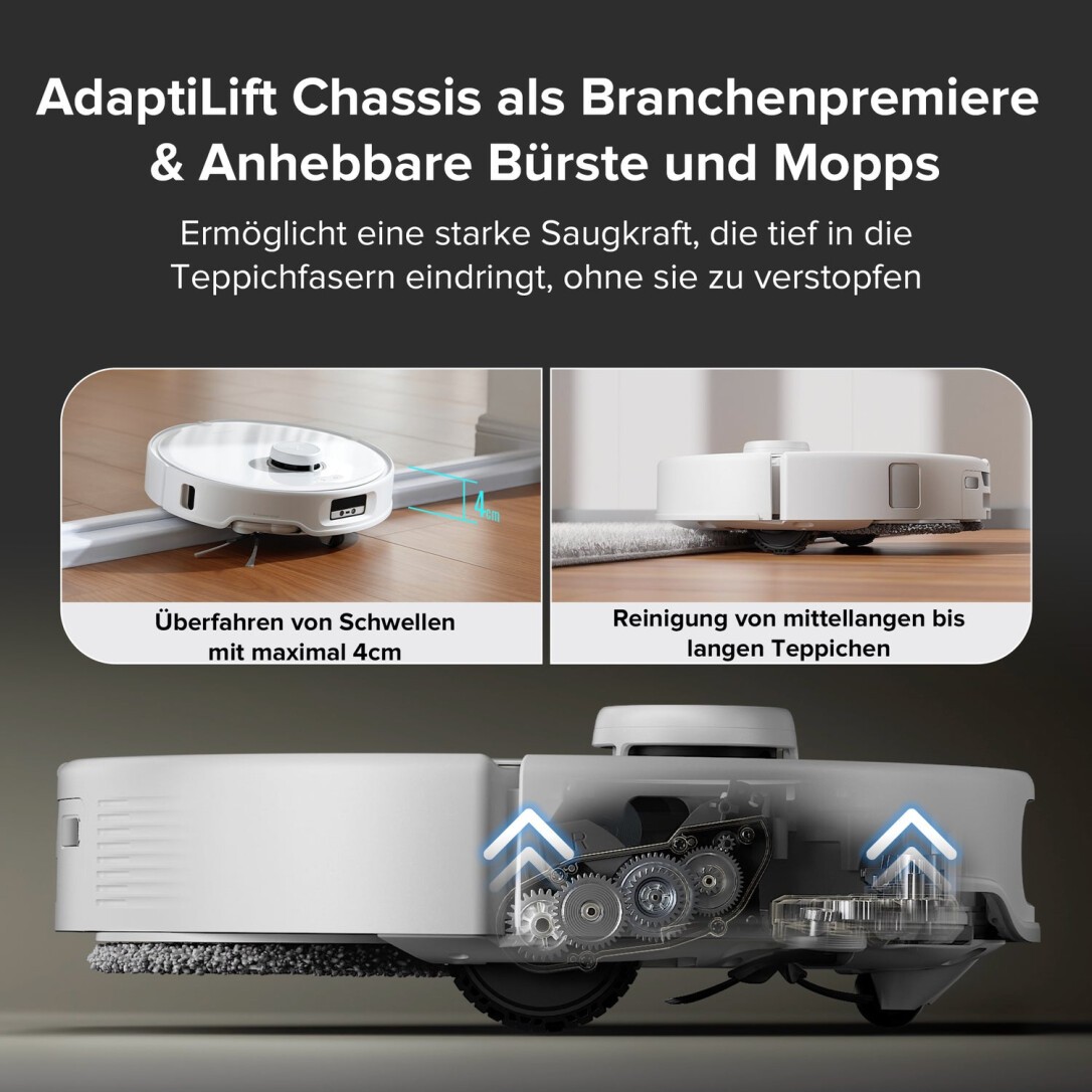 Roborock Qrevo Curv 5A1. Staubbehälter Typ: Beutellos, Produktfarbe: Schwarz, Weiß, Form: Rund. Geräuschpegel: 55 dB, Bürstentyp: Walzenbürste, Navigationstyp: LiDAR. Akku-/Batterietechnologie: Lithium-Ion (Li-Ion), Akku-/Batteriekapazität: 6400 mAh. Höhe: 103 mm, Breite: 352 mm, Tiefe: 347 mm. Verpackungsbreite: 507 mm, Verpackungstiefe: 552 mm, Verpackungshöhe: 534 mm